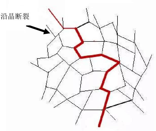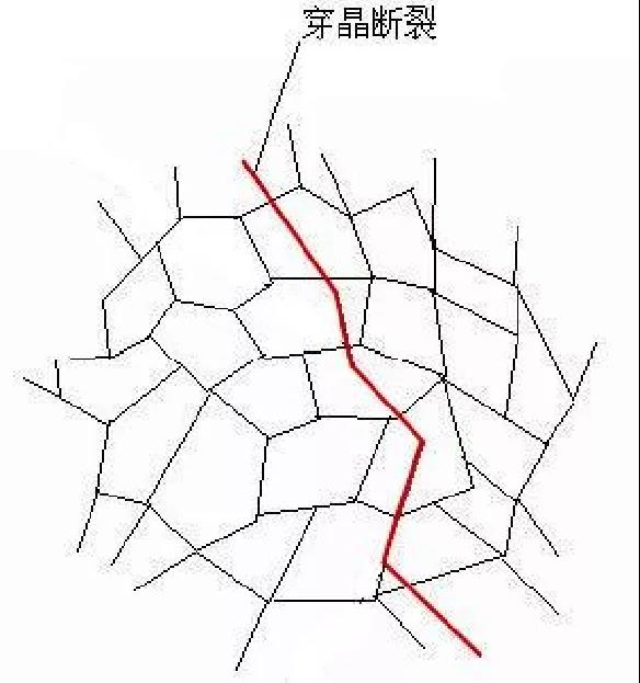 穿晶斷裂是裂紋在晶粒的內(nèi)部進(jìn)行擴(kuò)展。穿晶斷裂一般是韌性斷裂,當(dāng)其內(nèi)部積累了大量的位錯時晶粒本身的強(qiáng)度下降,進(jìn)而導(dǎo)致裂紋在晶粒的內(nèi)部產(chǎn)生。