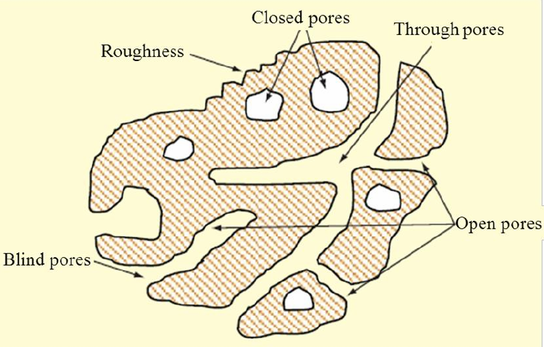多孔陶瓷材料是含有大量孔隙的材料,由連續的固體相和形成孔隙的流體相所組成。如圖所示,其孔結構可以分為閉孔和開孔結構。可以看到,閉孔為固體相所包圍,與外面流體介質無連通。
